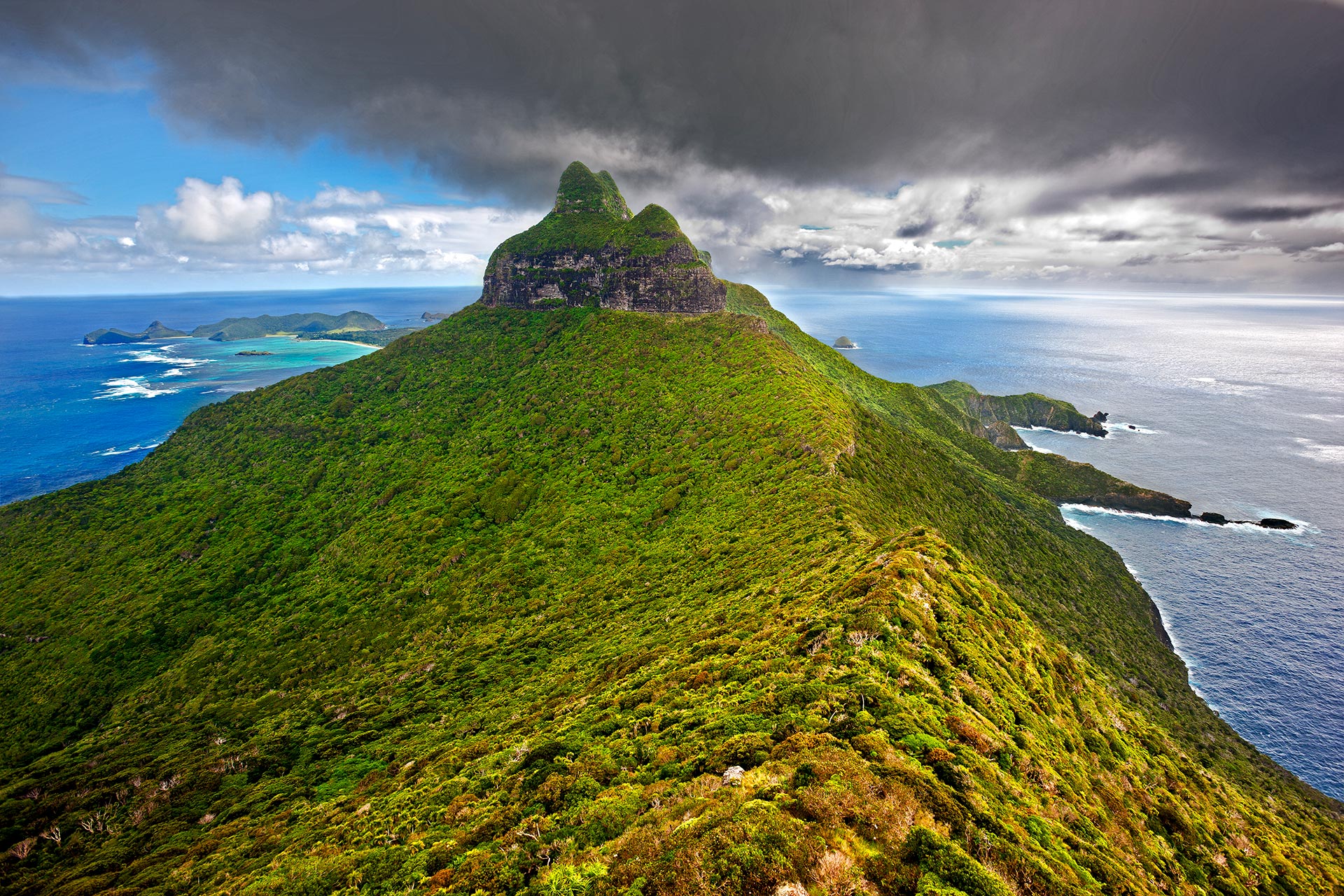 Mt Gower looking towards Mt Lidgbird while a fast moving rain squall moves to the North